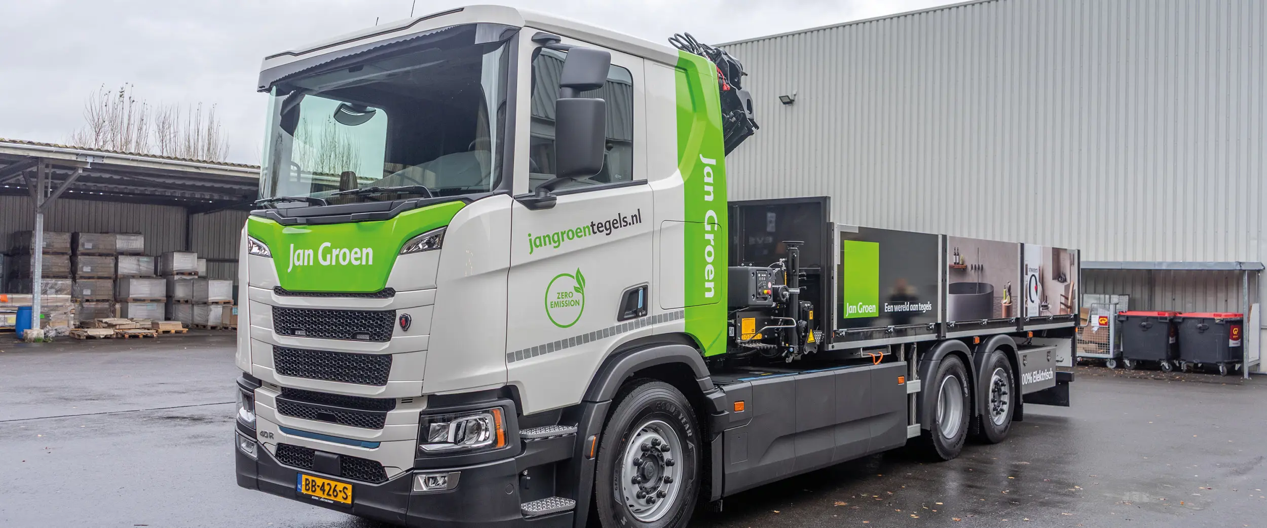 Voor grote leveringen bezorgen wij met de bezorgservice van Jan Groen. Dit doen we met twee vrachtwagens die voorzien is van een loskraan. Één van onze vrachtwagens rijdt 100% elektrisch en volledig zero-emissie. Waardoor we ook in milieu- en zero-emissiezones kunnen bezorgen. Het is daarom belangrijk dat de locatie goed en veilig bereikbaar is.